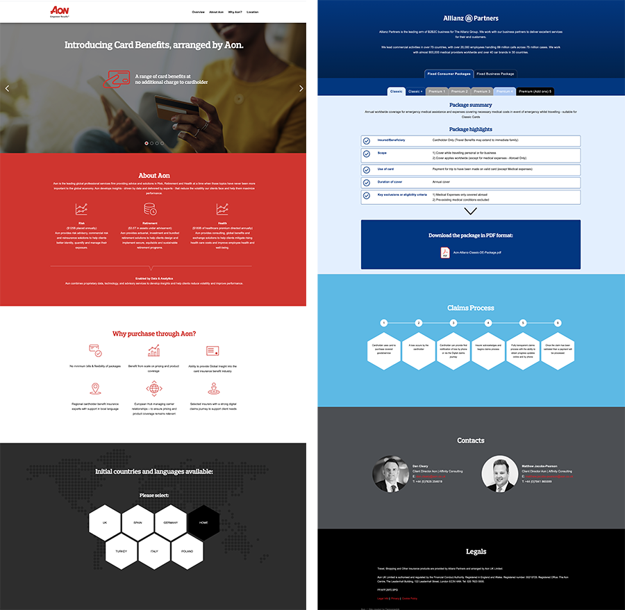 Aon and Visa, offering card insurance services across 6 countries, with a number of packages delivered by different insurers – all with detailed terms and pricing.